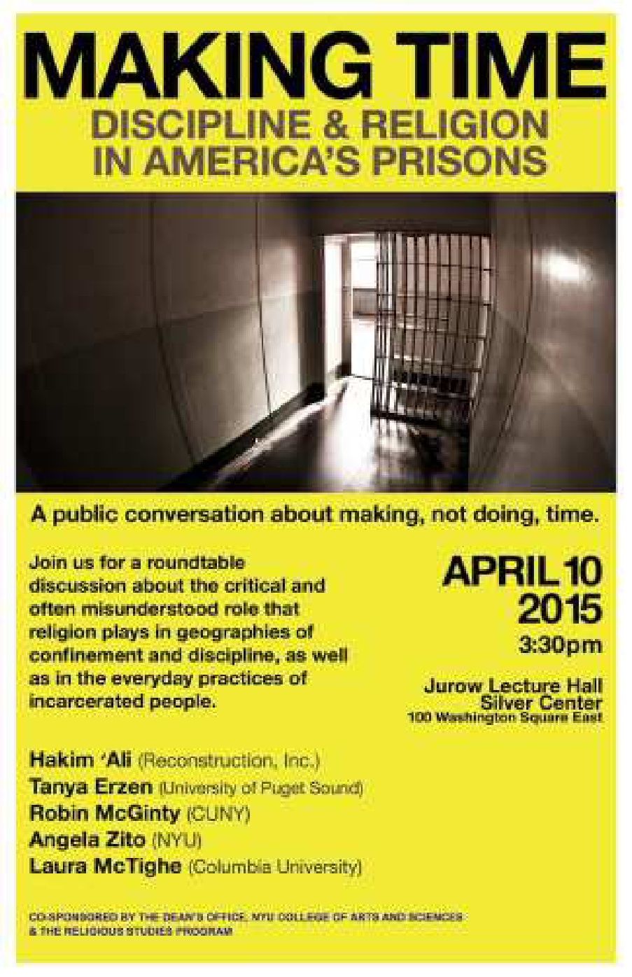 - “Making Time: Discipline and Religion in America’s Prisons.” Co-Organizer of a panel hosted at the Center for Religion and Media at New York University, April 2015.