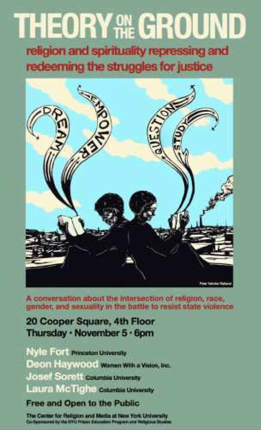 - “Theory on the Ground: religion and spirituality, repressing and redeeming the struggle for justice.” Co-Organizer of a panel hosted at the Center for Religion and Media at New York University, November 2015.