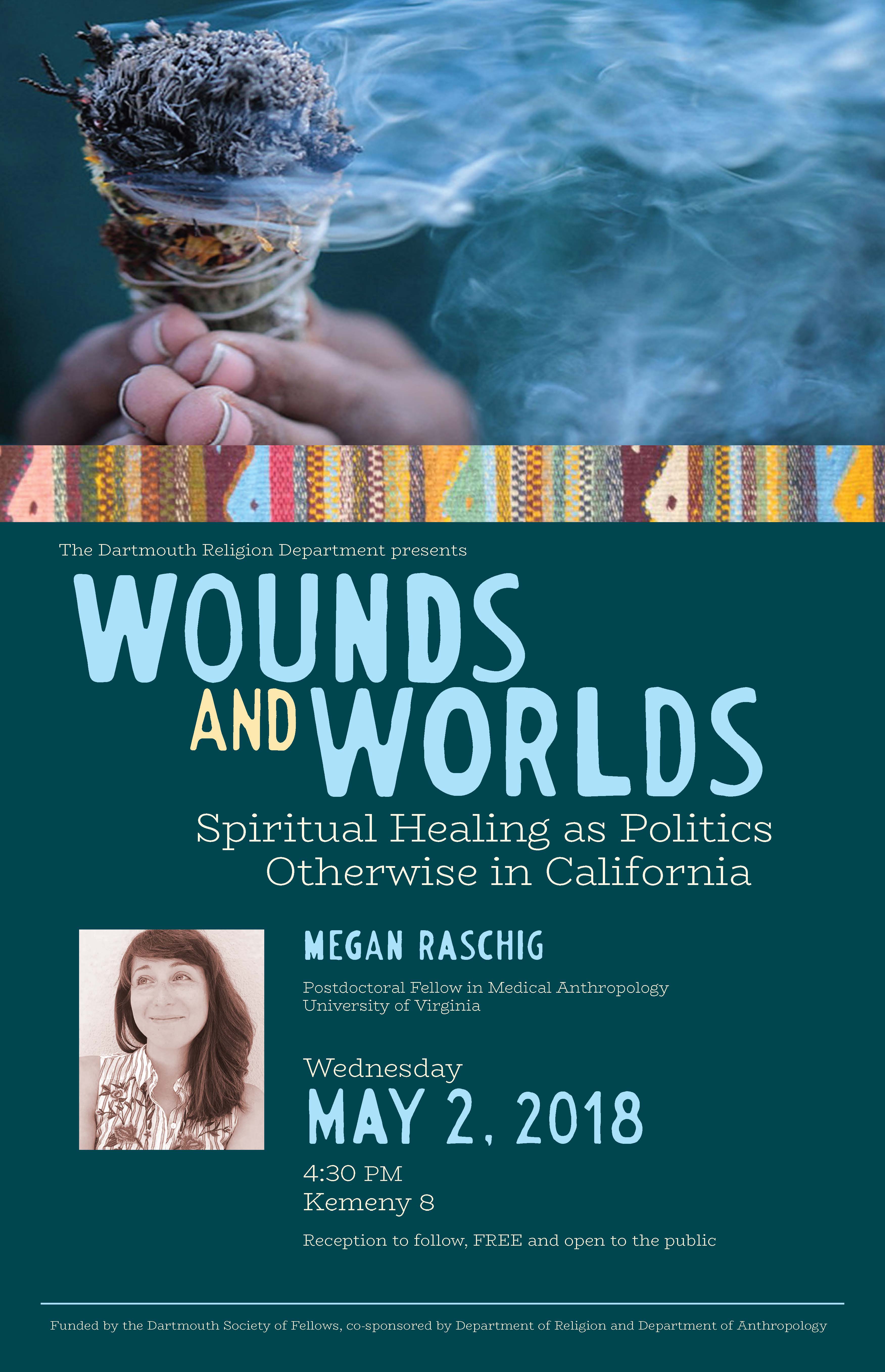 - “Wounds and Worlds: Spiritual healing as politics otherwise in California.” Organizer of a public talk and series of engaged conversations accompanying Megan Raschig’s work with Dartmouth College and the Upper Valley community as a Visiting Scholar.
