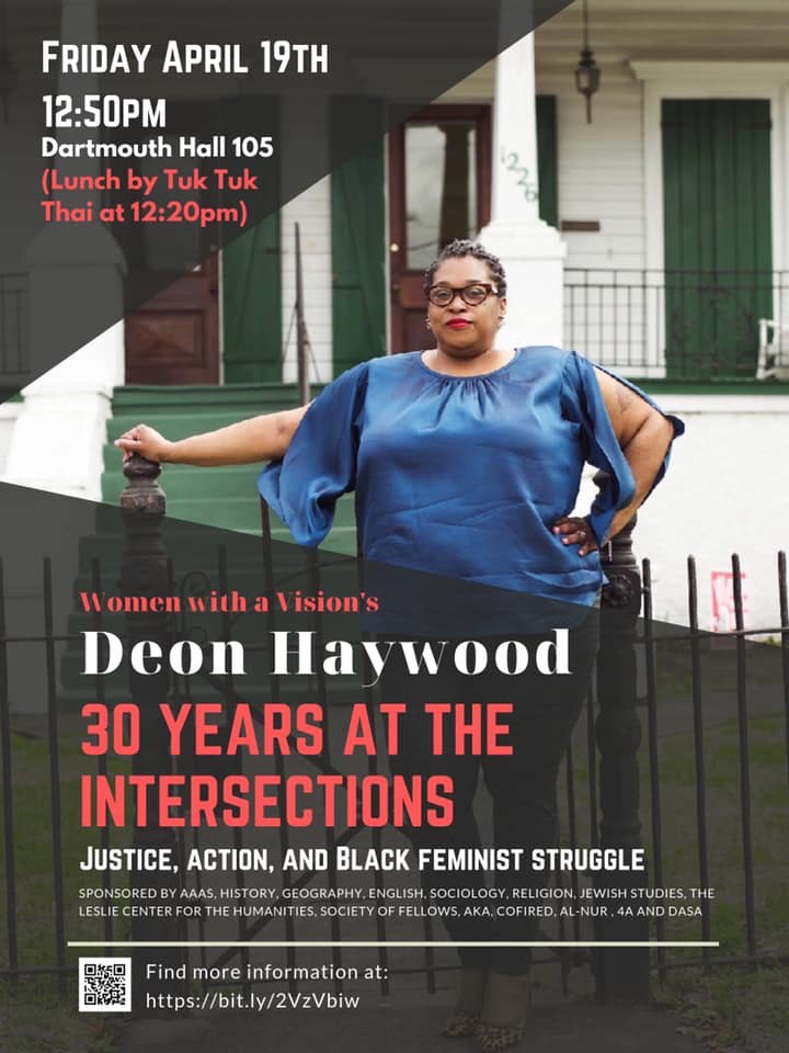 - “30 Years at the Intersections: Justice, Action, and Black Feminist Struggle.” Organizer of a week-long series of engaged conversations, student workshops, and porch talks accompanying Women With A Vision’s Deon Haywood and Shaquita Borden’s work with Dartmouth College and the Upper Valley as Visiting Scholars.